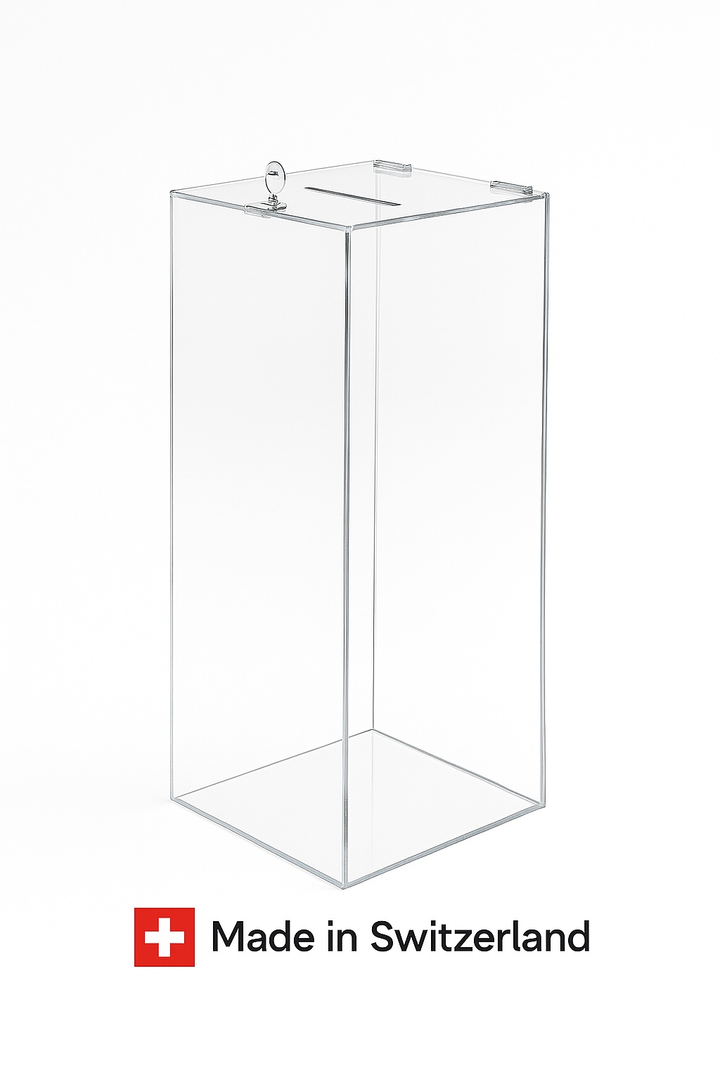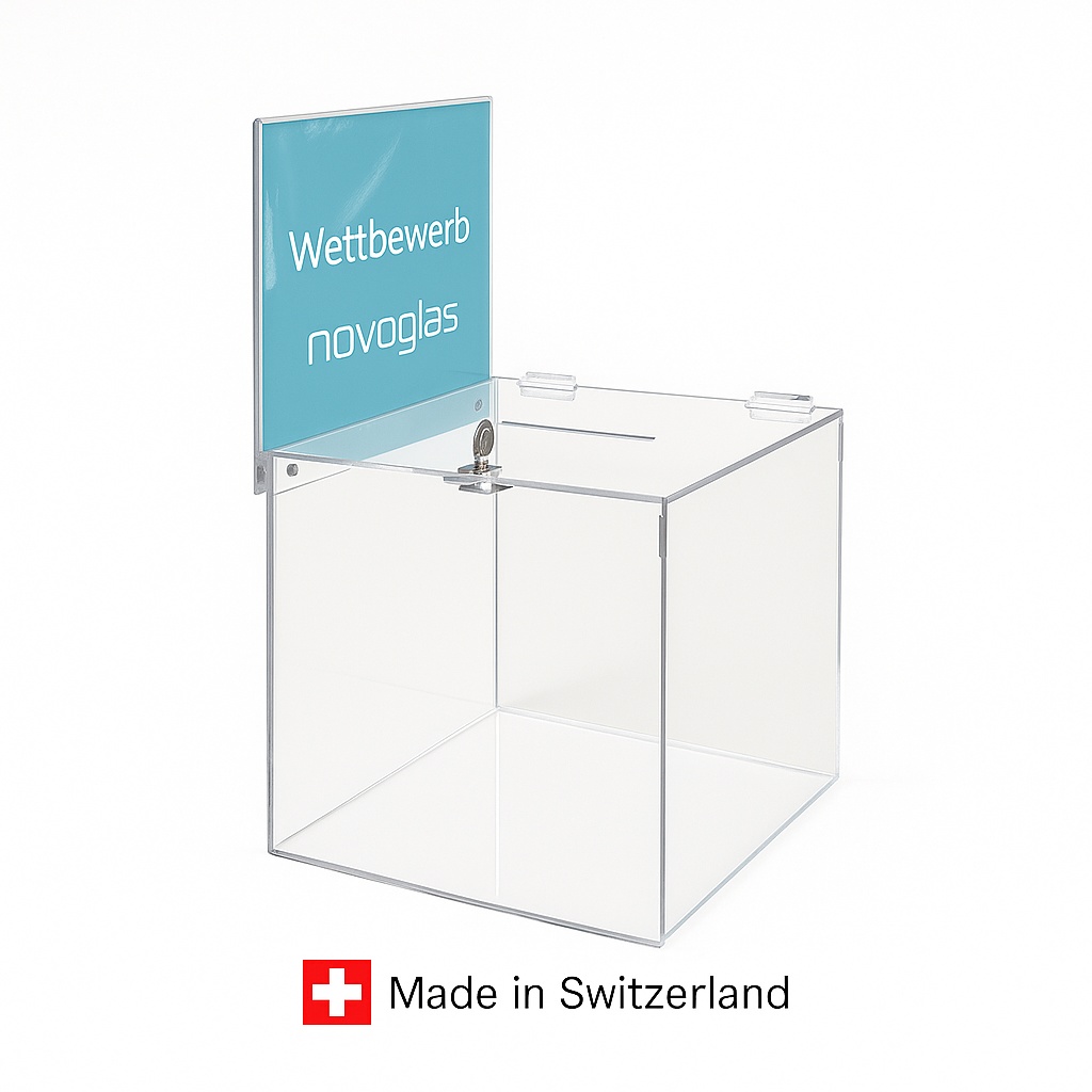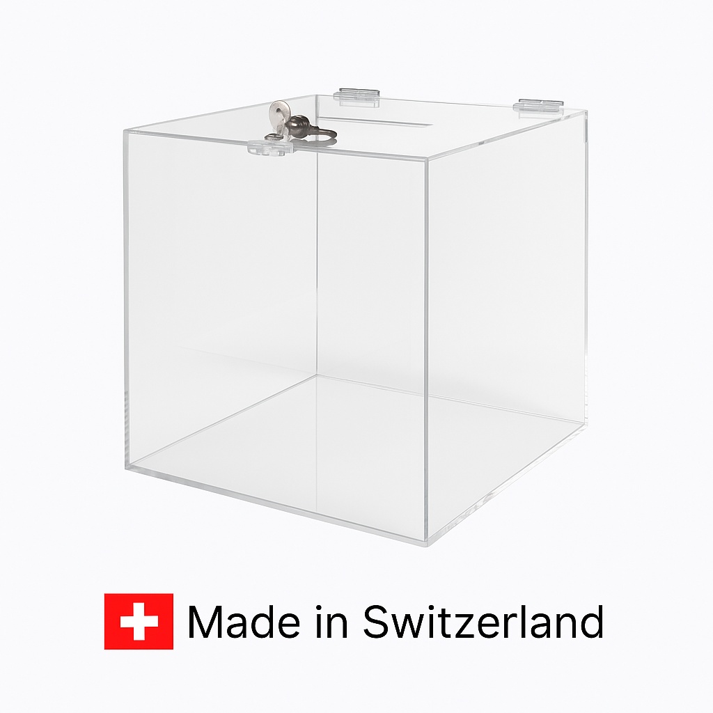 Lassen sie Ihrer Kreativität freien lauf und profitieren Sie von unserer langjährigen Erfahrung in der Produktion von Spendenboxen und Wahlurnen. Ob glasklar oder farbig, mit Schloss und Plakattasche, Bedruckt mit Ihrem Firmenlogo oder Graviert.