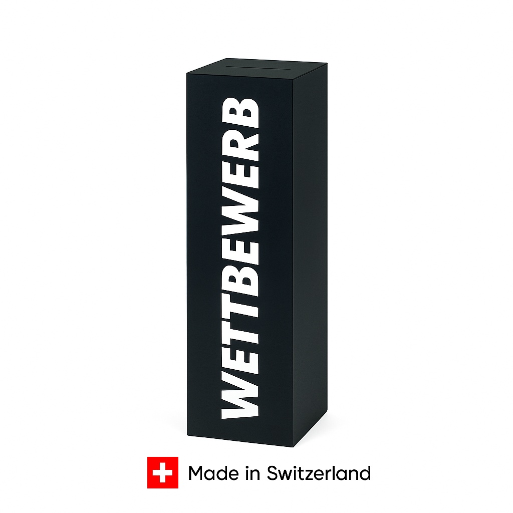 Die deluxe Variante unseres Bestsellers! Die Wettbewerbsurne in schwarz matt mit zweiseitiger 3D-Beschriftung aus Plexiglas weiss 3mm.